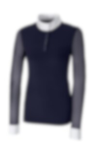 Med den här tävlingstoppen från Pikeur kommer du verkligen vara snyggast på tävlingsplatsen. Elonie tävlingsskjorta är i en vacker marinblå färg med vit krage med Pikeur skrivet i små kristaller och vita ärmslut med dolda tryckknappar. Tävlingsskjortan har mesh ärmar för bästa comfort under varma sommardagar. Du kan enkelt öppna upp i kragen med dolda knappar framtill som är pryd med kristaller.
